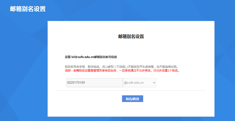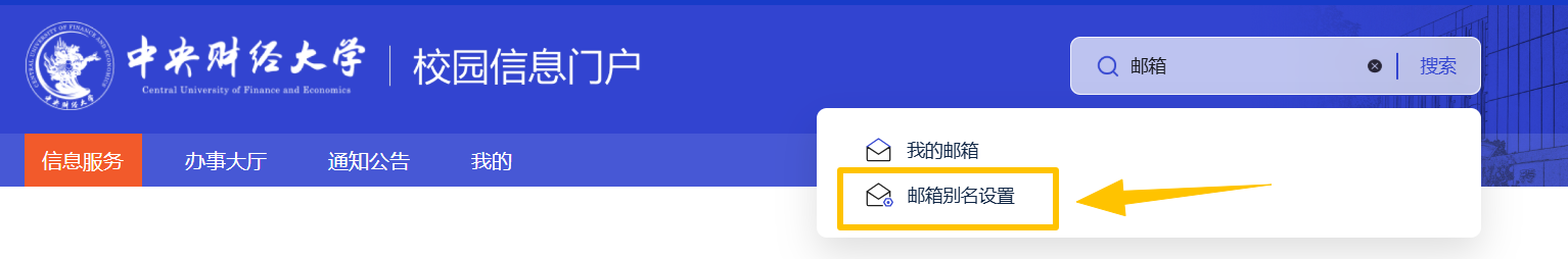 校园邮箱初始格式为工号@cufe.edu.cn;学号@email.cufe.edu.cn,如需要个性化邮箱名可登录“校园信息门户”,在搜索框输入“邮箱”,选择“邮箱别名申请”,编辑提交别名设置,由管理员进行审核,审核通过后可用别名邮箱收发邮件。