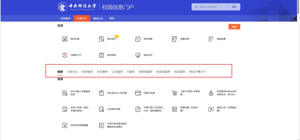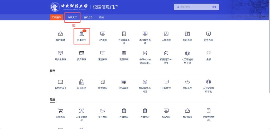3、如在使用办事大厅过程中遇到问题,可随时联系智慧校园建设中心(杨玲,联系电话:62288102,邮箱:yangling@cufe.edu.cn)。