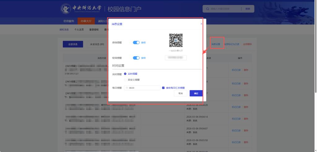 点击【我的消息】- 【消息设置】可选择接收消息的渠道:微信,邮箱等。当相关事项有新的进度时,会收到提示消息。