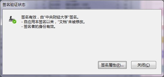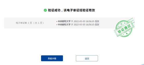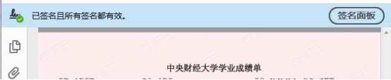 点击凭证文件下方的中央财经大学学业证明专用章,即可看到签名验证状态,直观验证文件的真实性和有效性。