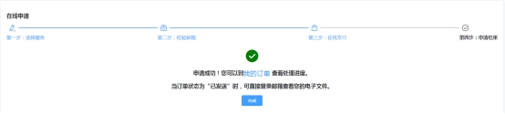 4.出现申请成功页面,到“我的订单”中查看处理进度,当订单状态为“已发送”时,可直接登录邮箱查看电子文件。