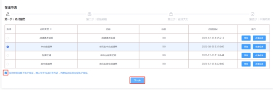 1.选择需要申请的凭证类型,点击“选择”左边的圆圈标记后,先点击“预览”生成预览文件,若内容无误,勾选下方的“我已仔细阅读了收费标准并检查了电子凭证,确认了电子凭证内容无误,同意按此标准生成电子凭证”,点击“下一步”;