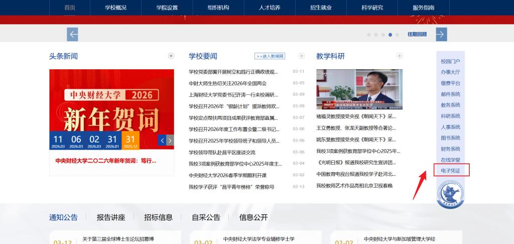 PC端登录方式一:通过中央财经大学官网(https://www.cufe.edu.cn/)右侧快速入口,点击“电子凭证”登录可信平台。