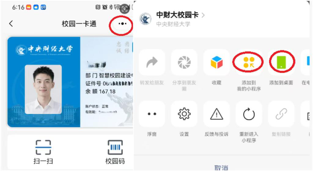 (1)可以把“中财大校园卡”小程序放置在手机桌面,避免每次使用时需要打开微信。或者把它拉至“我的小程序”栏目下,避免使用前需要进行搜索或扫码。