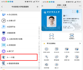 Tips:首次使用前,建议退出微信程序,重新登录进入,可消除手机缓存内容,避免出现找不到“A-一卡通”栏目的情况。