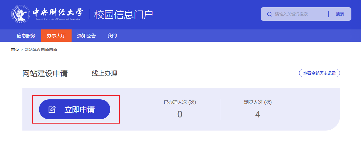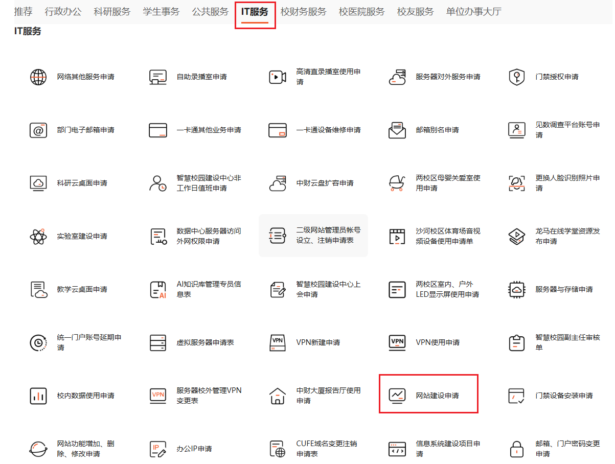 (注:若网站已有域名。可直接申请网站建设,若没有域名,则需先申请域名再申请网站建设,域名申请流程见:http://zhxy.cufe.edu.cn/info/1054/1643.htm)